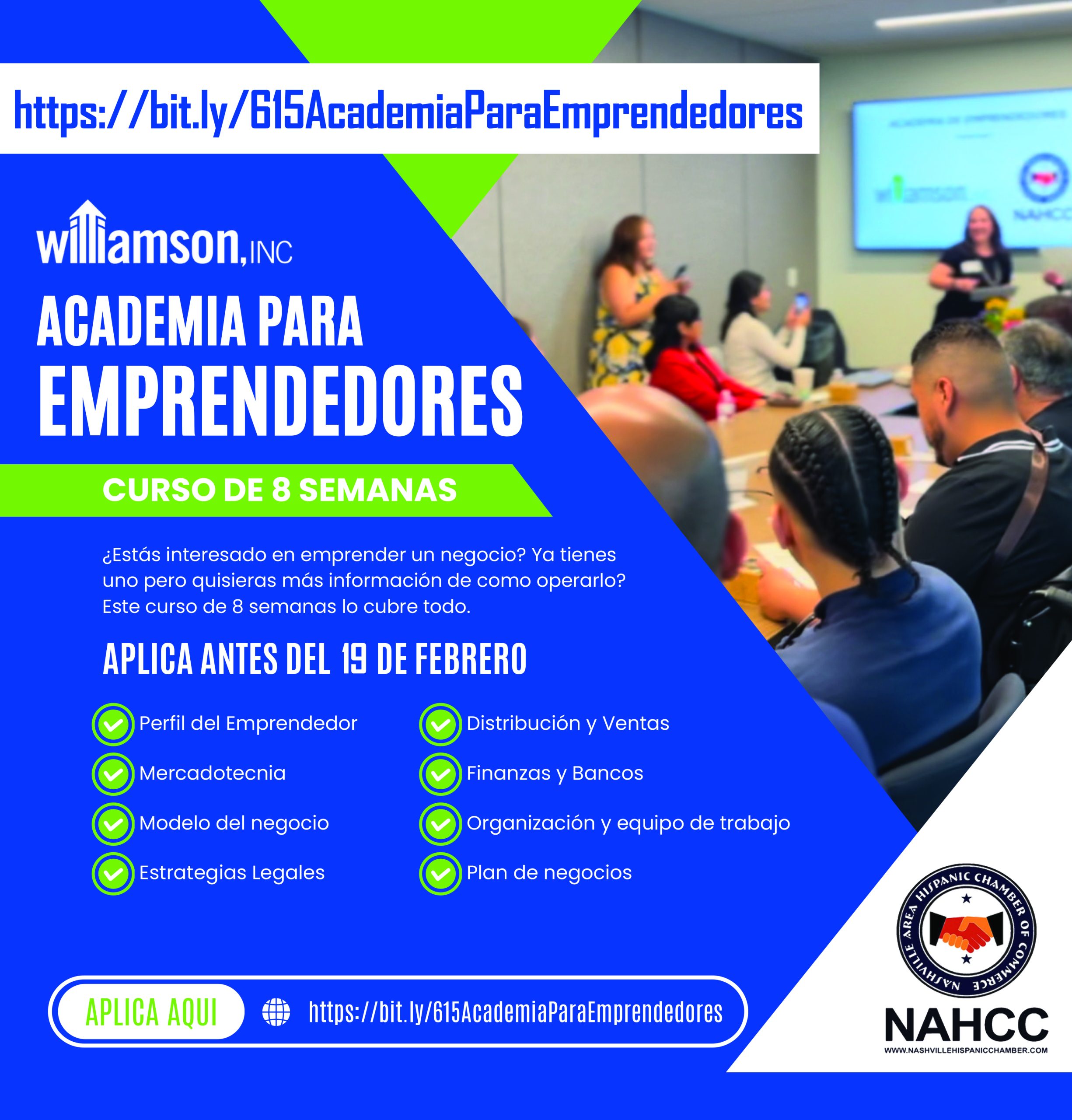 Williamson, Inc. y la Cámara de Comercio Hispana de Nashville (NAHCC) presentan por tercer año consecutivo y bajo el modelo de Kauffman Foundation, su Academia para emprendedores.